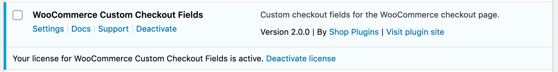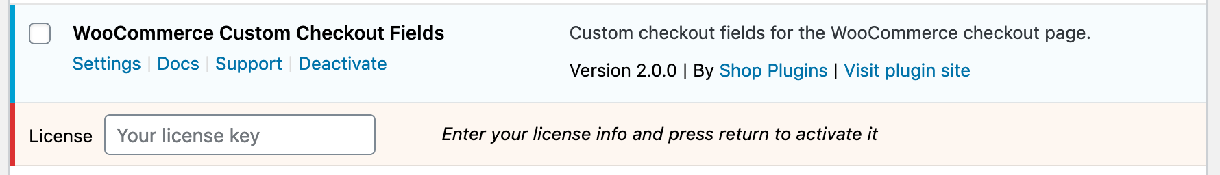 After the plugin is activated go to the plugins page and find the License area under WooCommerce Custom Checkout Fields.