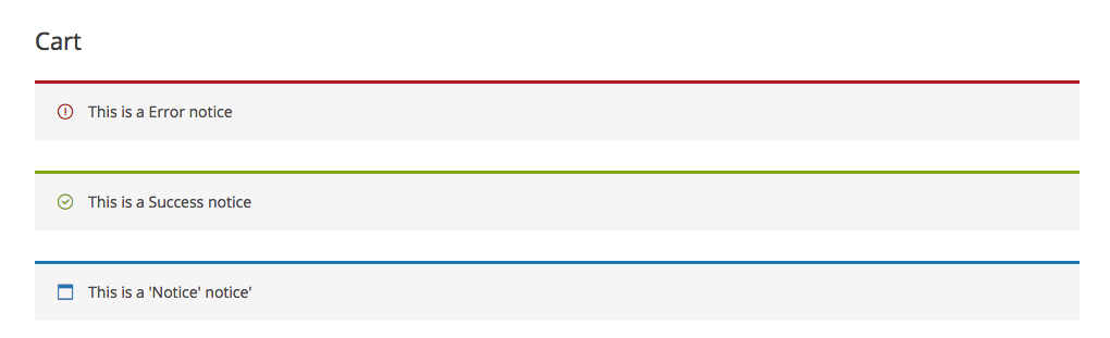 WooCommerce has made it a breeze to manually add new notices to your website. Take a look at the following basic example code; this will add the three different notices to your website.
