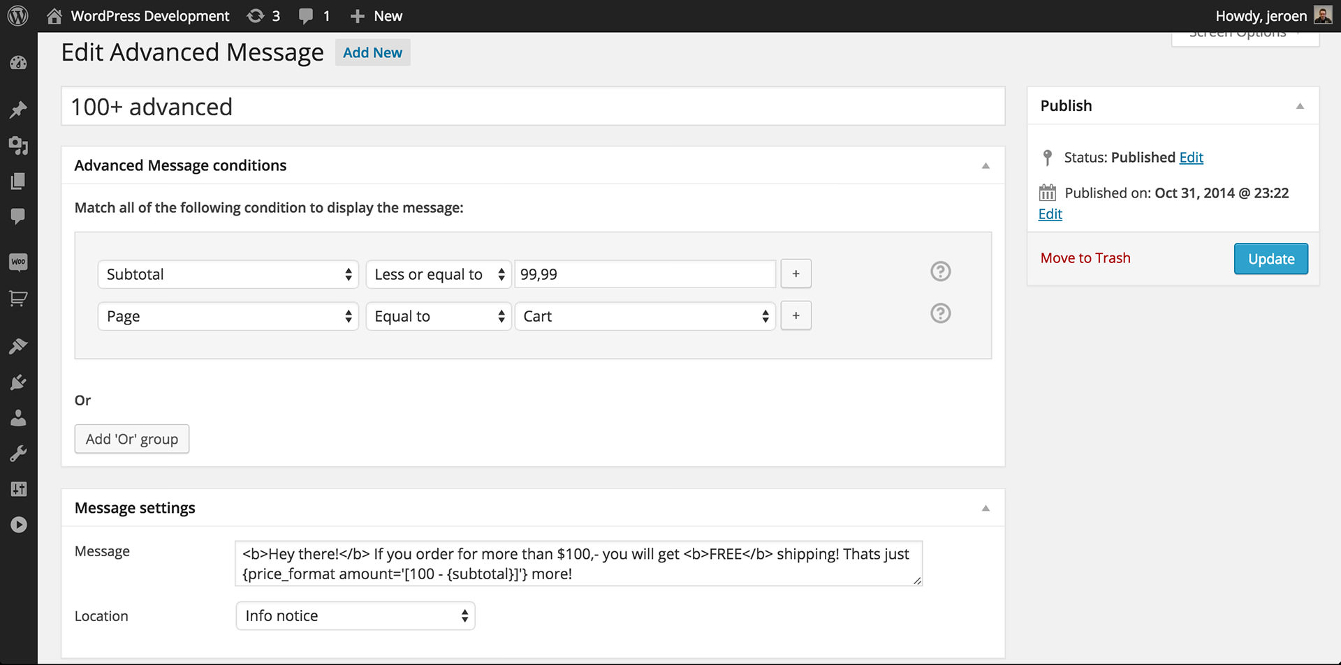 Of course, these are just examples of conditional store notices. You can modify the code to your needs. Here are a couple more variables that may be of use just like the $subtotal.