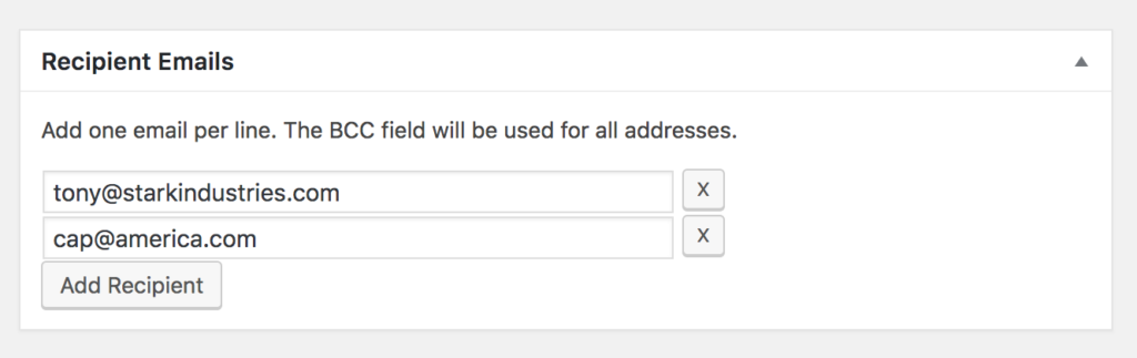 Notices can be setup to be sent to one or many email addresses. Simply add an email to the Recipient Emails list and the notice will be sent with each address in the BCC line.