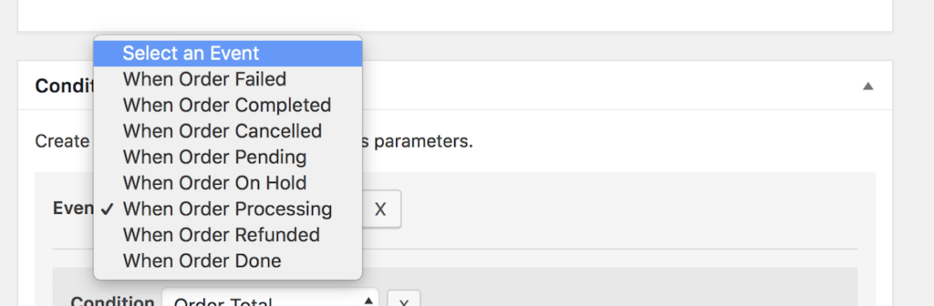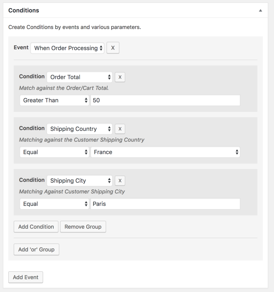 This example set of conditions will send a notification for orders that are greater than $50, and set to ship to Paris, France.