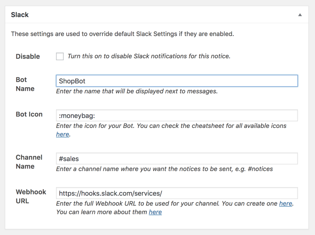 Everyone love Slack! Send notifications of WooCommerce orders to your Slack channel to update team members. Setup global slack settings or settings per-notice. You can set the name of the bot, the icon for the bot, and the channel the notice will appear in.