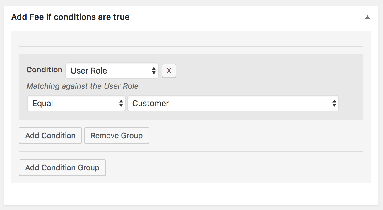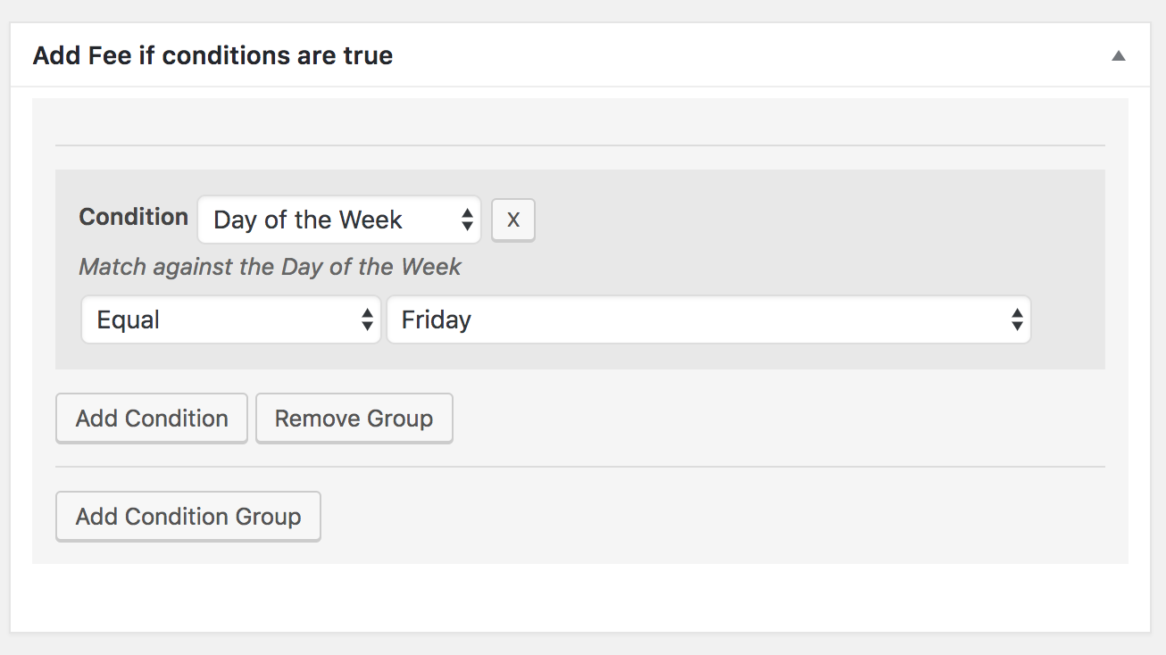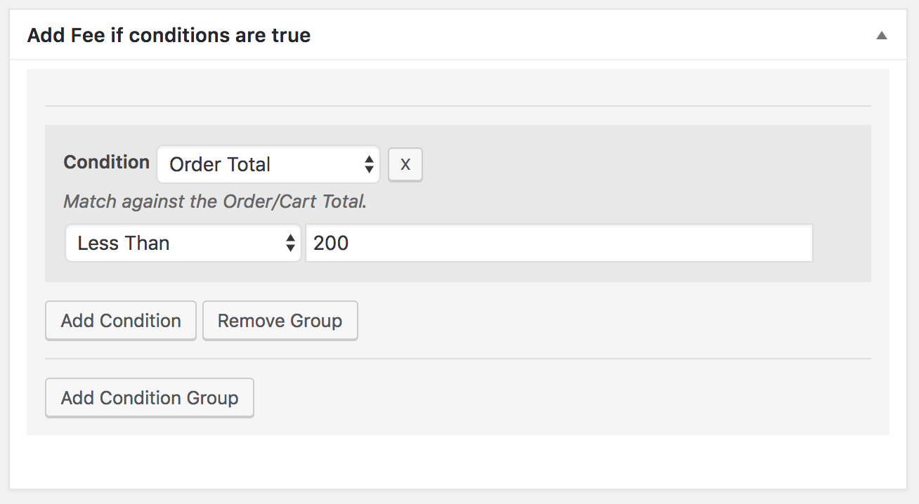 WooCommerce Fee Manager includes a condition engine to define preset rules that are compared with each order placed in the web shop. If the rules are true, then the defined fee is added to the order.