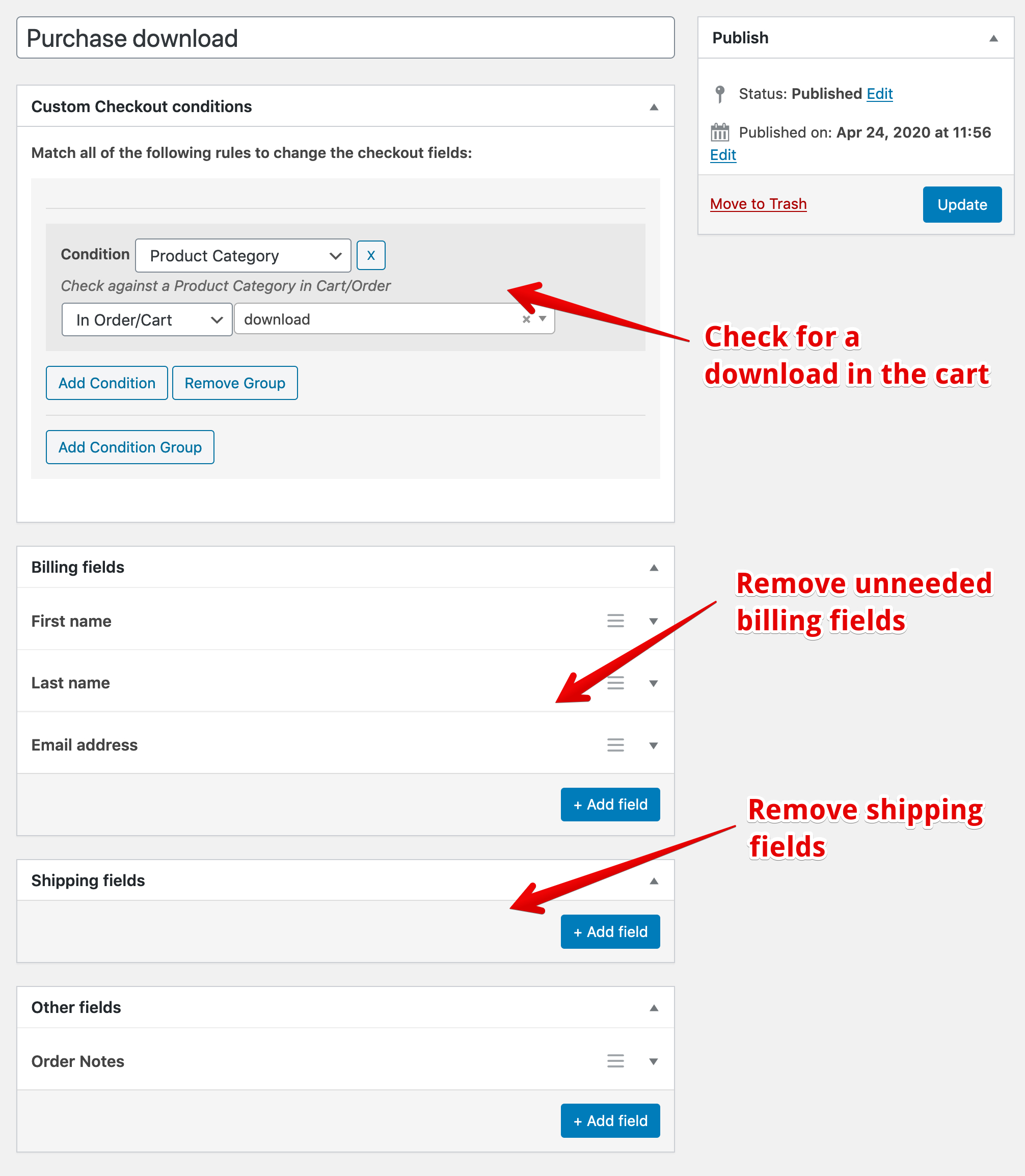 If your store sells downloadable files and you don’t want a bunch of unneeded fields at checkout you can remove some billing fields and all checkout fields when a “download” category is in the cart.
