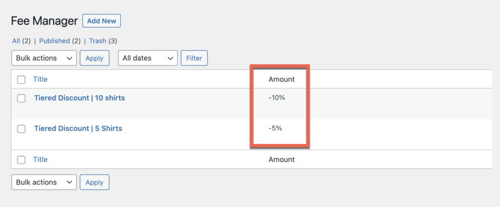 Use multiple fees to create a discount for specific tiers or combinations of purchases. Below we illustrate a tiered quantity discount using two fees and the product category. Customers receive a 5% discount on orders of 5 shirts but a 10% discount on orders of 10 shirts or more.