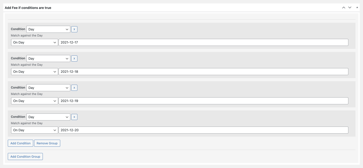 In many countries trying to deliver products on specific holidays can be a logistical nightmare. Not only are resources such as staff limited but the added costs of shipping can be astronomical. Easily setup fees in your store for the dates you know will require extra hands on deck.