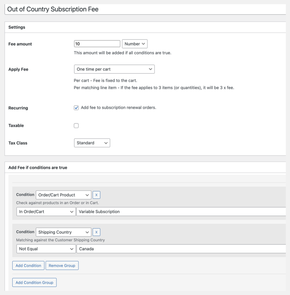 Automatically charge a recurring fee on subscription renewals. In the example below subscription orders outside of Canada incur a $10 fee.