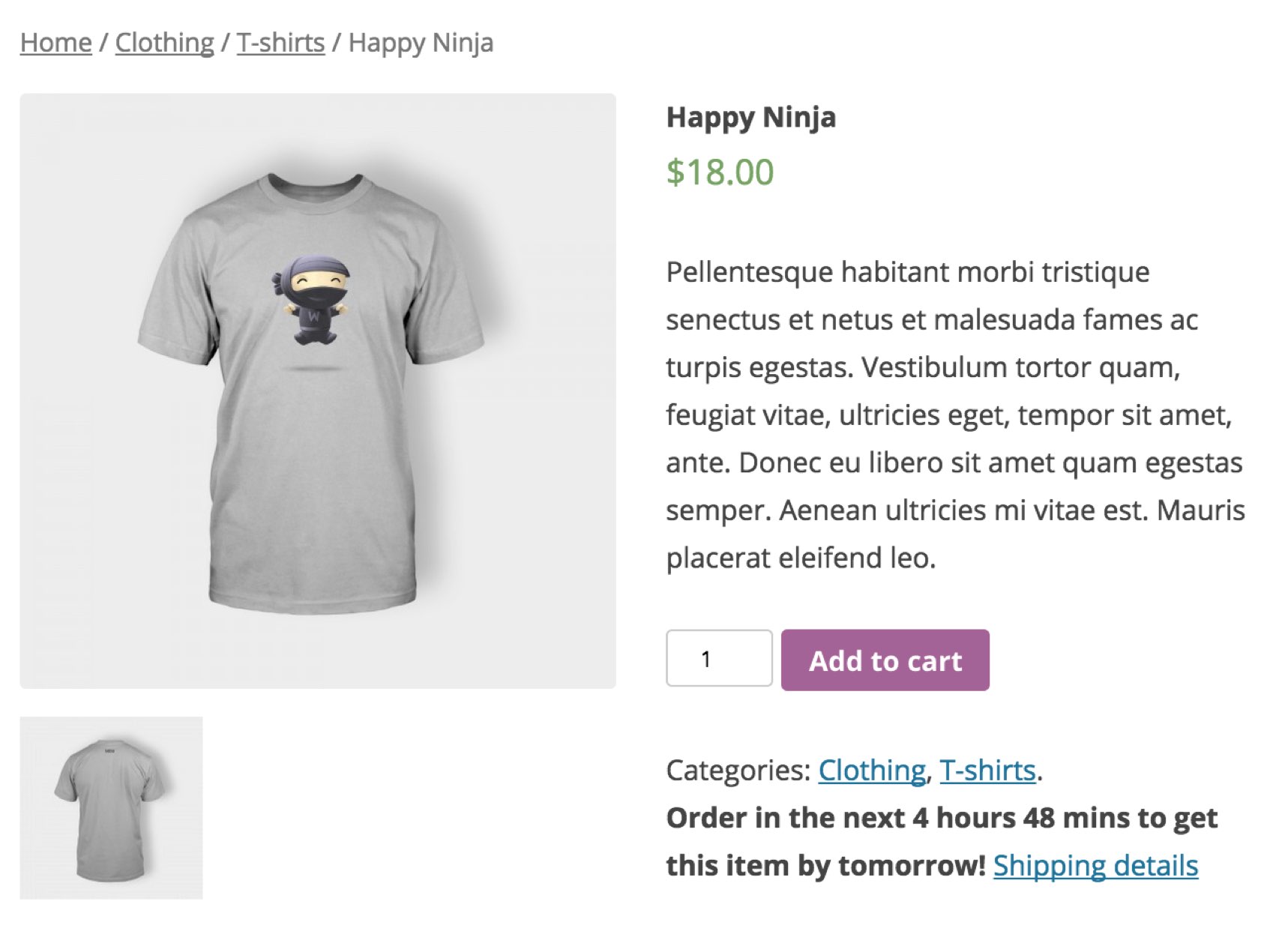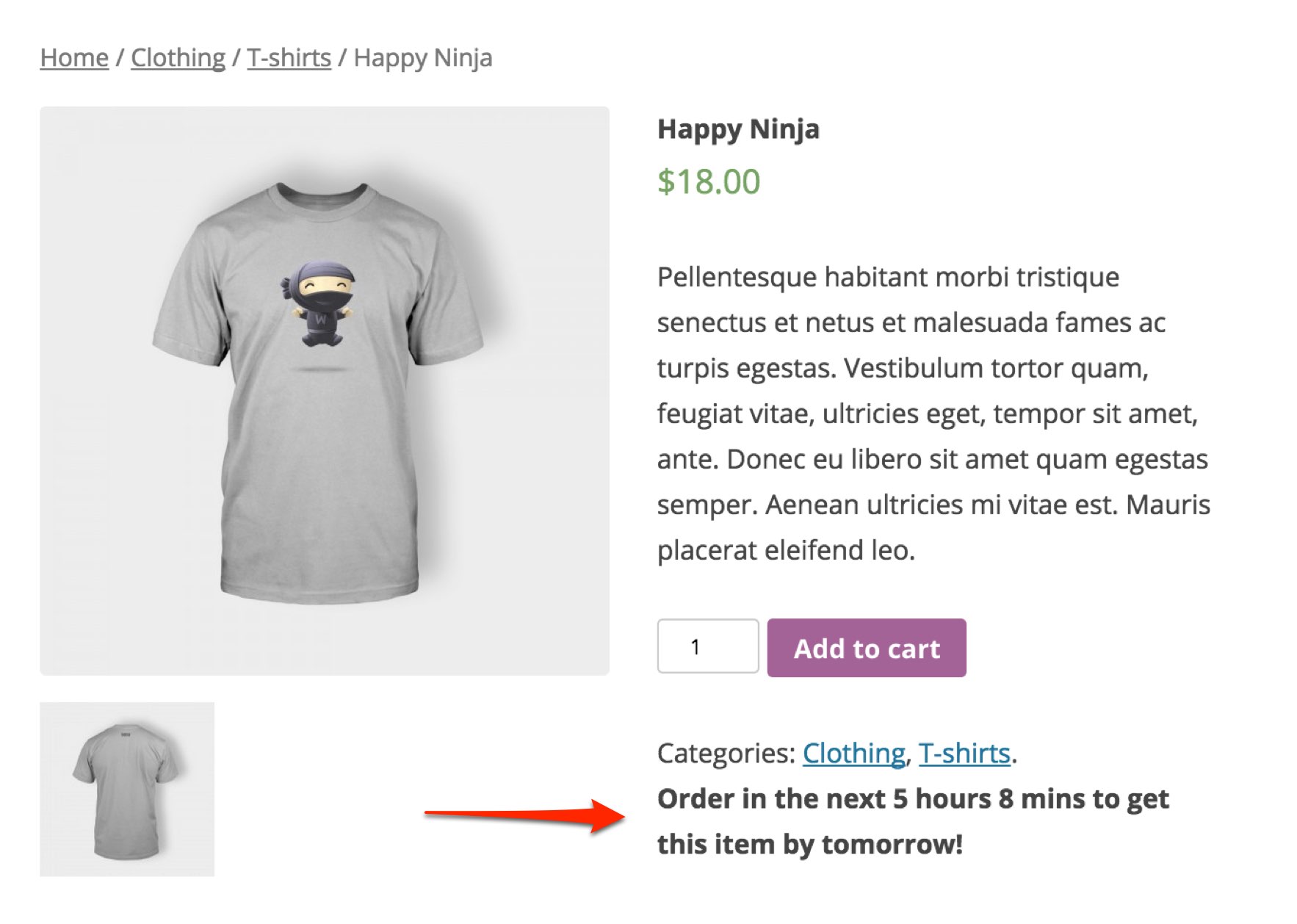 To show how to use WooCommerce Advanced Messages to add an “Order By” shipping deadline message to WooCommerce product pages, I’ll use the example of selling T-Shirts that can be delivered overnight if ordered by 6:00 PM Monday through Friday. Saturday and Sunday orders take two days.