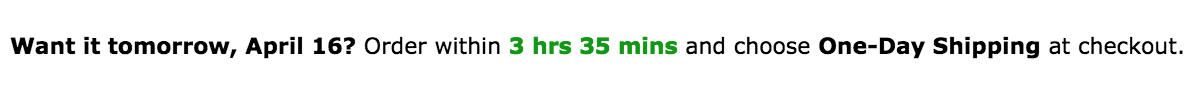 This type of message clearly communicates to your customers when they can expect to receive a product if they act before the time remaining. If they are comparing your store to another store, it motivates them to use the shop that can get it to them the quickest.
