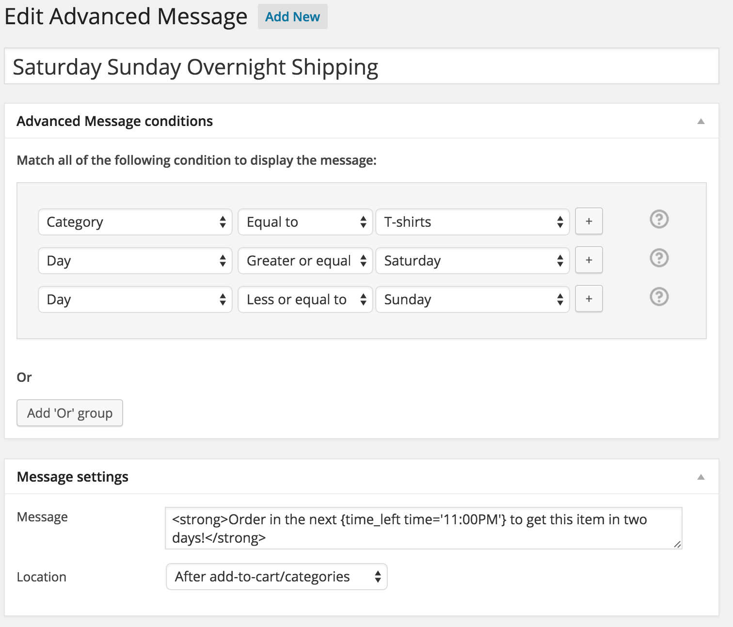 After installing the plugin, adding a message is easy. For my shipping example I add two messages – one for Monday through Friday and one for Saturday to Sunday.