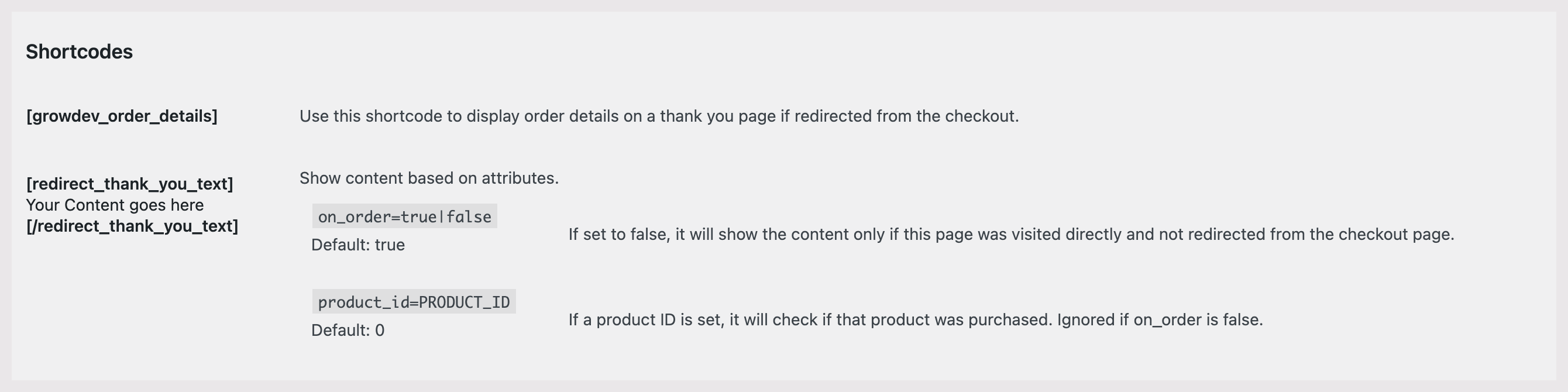 Using the shortcode [growdev_order_details] will add the customer’s order details to the thank you page. This can also be combined with any of the previously mentioned shortcodes to display additional options on the thank you page.