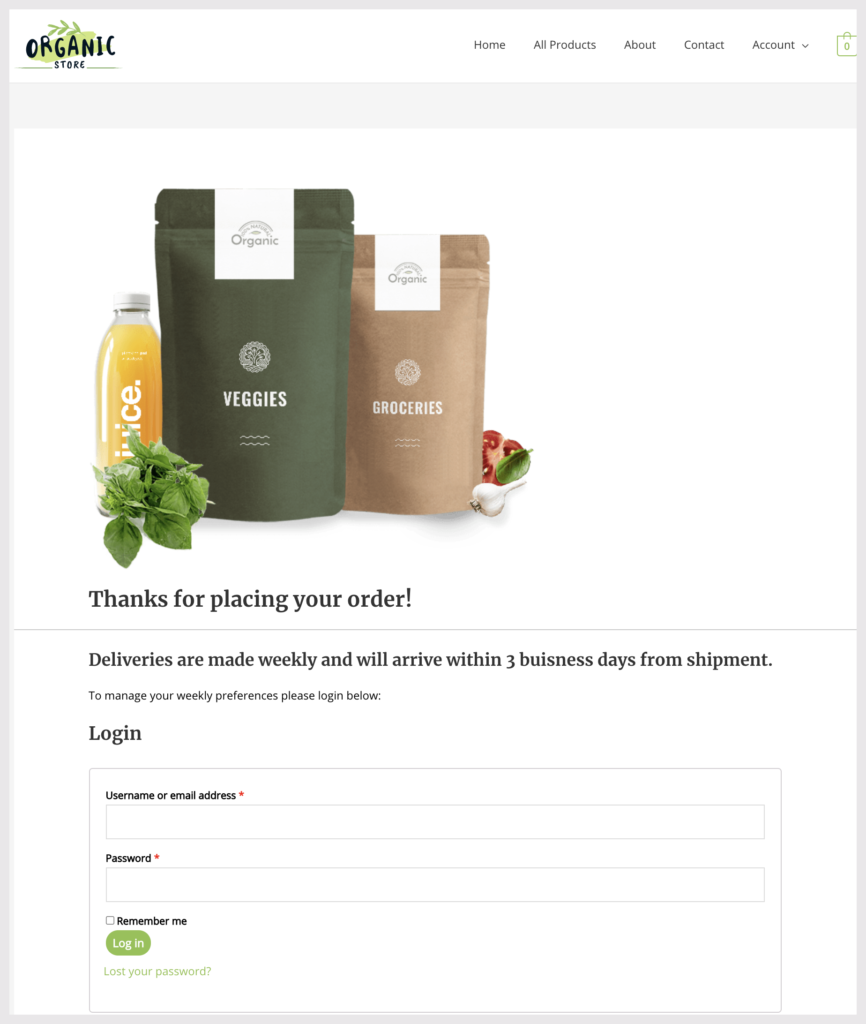 This will display the My Account page login details on your thank you page.