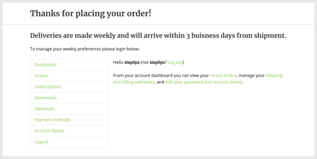 In this example we add the customer’s order details [growdev_order_details] along with [products limit=”3″ columns=”3″ orderby=”popularity” on_sale=”true” ] to show popular on sale products at the bottom of the page.